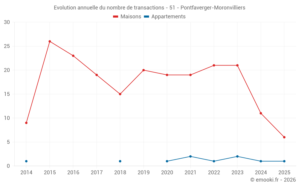 Le prix médian sur les 27 transactions de maisons des 24 derniers mois dans la commune de Pontfaverger-Moronvilliers était de 1 800 € par mètre carré pour une valeur foncière médiane de 180 000 €. Sur cette période 60% des transactions se sont situées entre 1 452 et 2 208 € par mètre carré (du 2ème au 8ème déciles).