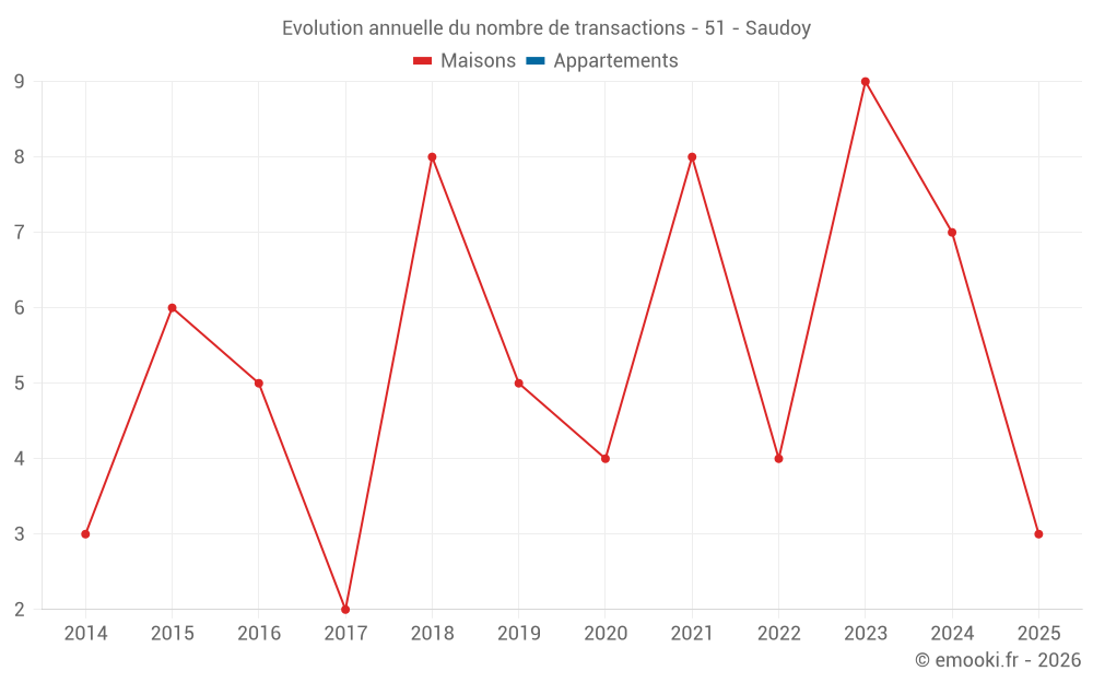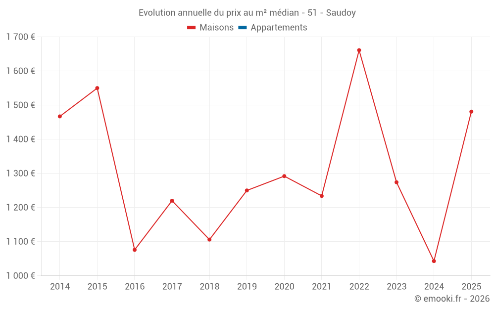 Le prix médian sur les 16 transactions de maisons des 24 derniers mois dans la commune de Saudoy était de 1 296 € par mètre carré pour une valeur foncière médiane de 108 495 €. Sur cette période 60% des transactions se sont situées entre 818 et 1 722 € par mètre carré (du 2ème au 8ème déciles).