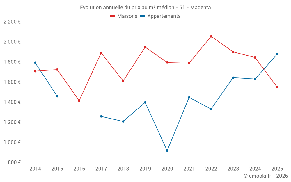 Le prix médian sur les 18 transactions de maisons des 24 derniers mois dans la commune de Magenta était de 1 858 € par mètre carré pour une valeur foncière médiane de 170 000 €. Sur cette période 60% des transactions se sont situées entre 1 632 et 2 513 € par mètre carré (du 2ème au 8ème déciles).