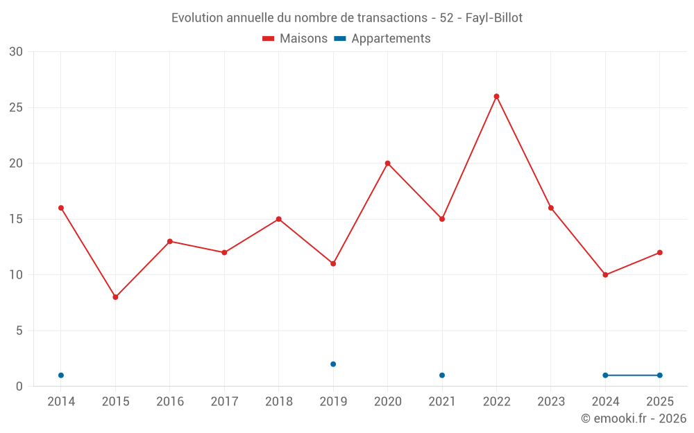 Le prix médian sur les 19 transactions de maisons des 12 derniers mois dans la commune de Fayl-Billot était de 777 € par mètre carré pour une valeur foncière médiane de 65 000 €. Sur cette période 60% des transactions se sont situées entre 373 et 1 028 € par mètre carré (du 2ème au 8ème déciles).