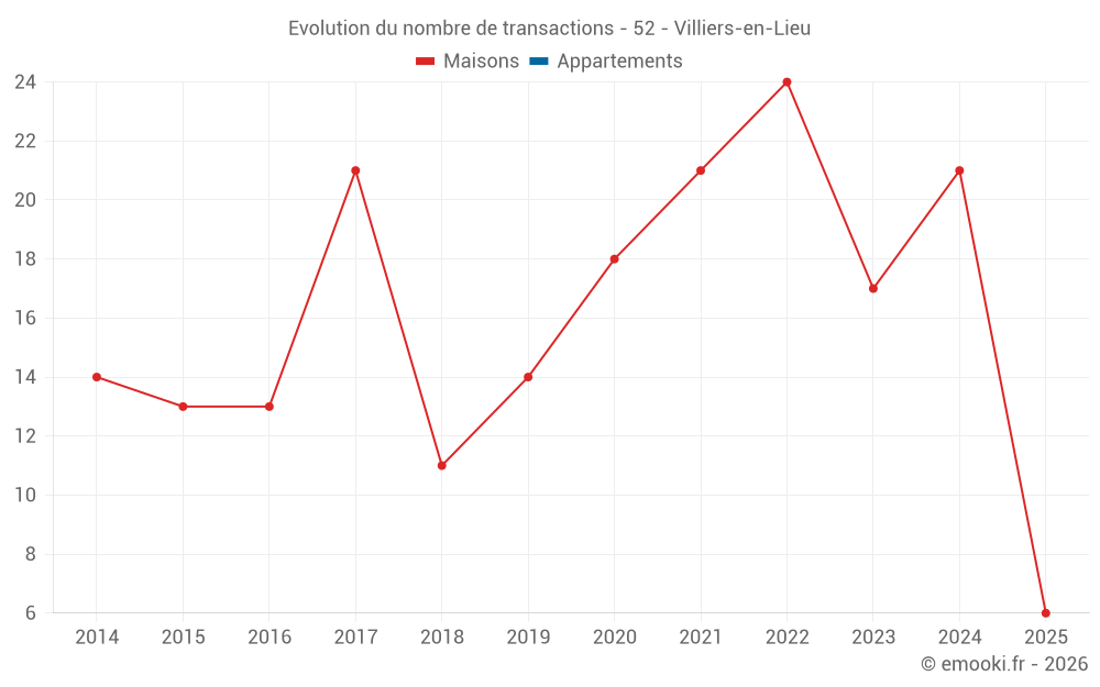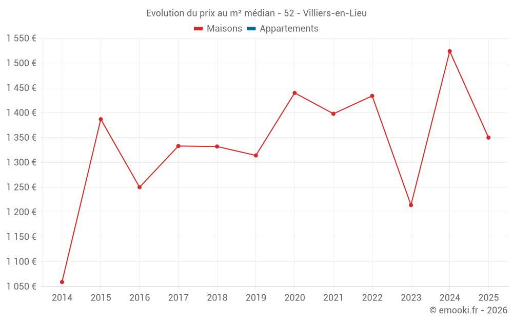 Le prix médian sur les 19 transactions de maisons des 12 derniers mois dans la commune de Villiers-en-Lieu était de 1 417 € par mètre carré pour une valeur foncière médiane de 143 000 €. Sur cette période 60% des transactions se sont situées entre 1 000 et 1 790 € par mètre carré (du 2ème au 8ème déciles).