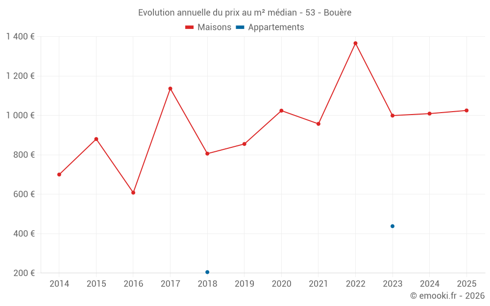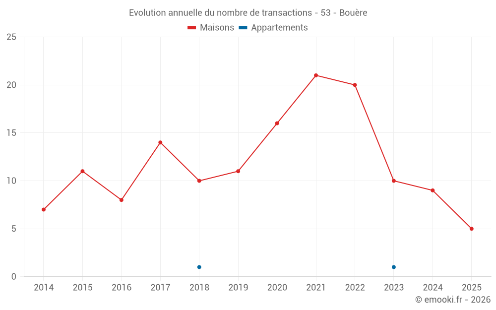 Le prix médian sur les 20 transactions de maisons des 24 derniers mois dans la commune de Bouère était de 1 004 € par mètre carré pour une valeur foncière médiane de 109 850 €. Sur cette période 60% des transactions se sont situées entre 797 et 1 219 € par mètre carré (du 2ème au 8ème déciles).