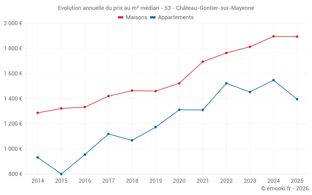 Le prix médian sur les 24 transactions de maisons des 3 derniers mois dans la commune de Château-Gontier-sur-Mayenne était de 1 936 € par mètre carré pour une valeur foncière médiane de 201 000 €. Sur cette période 60% des transactions se sont situées entre 1 561 et 2 248 € par mètre carré (du 2ème au 8ème déciles).