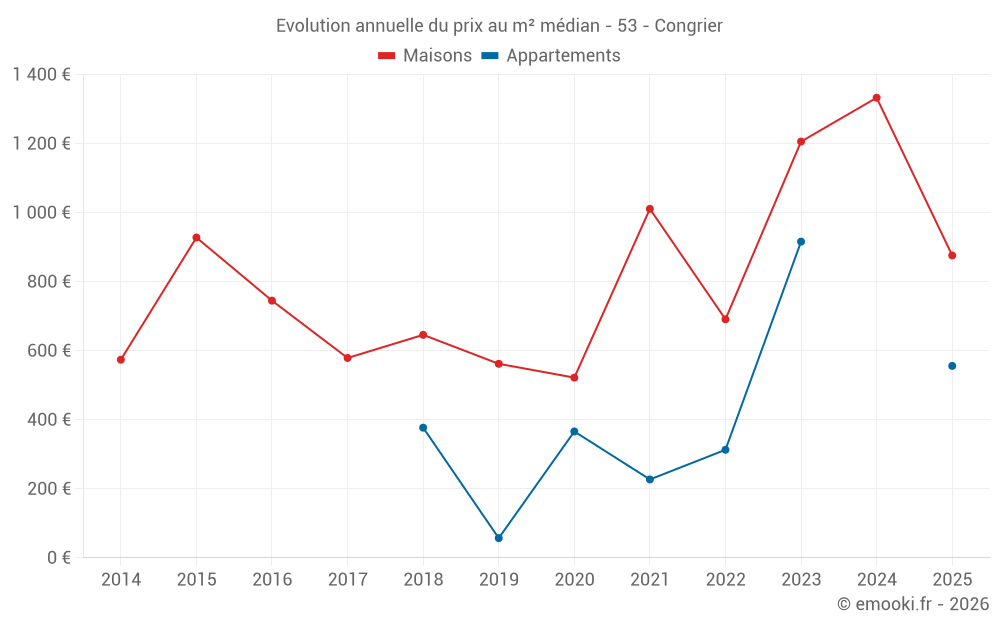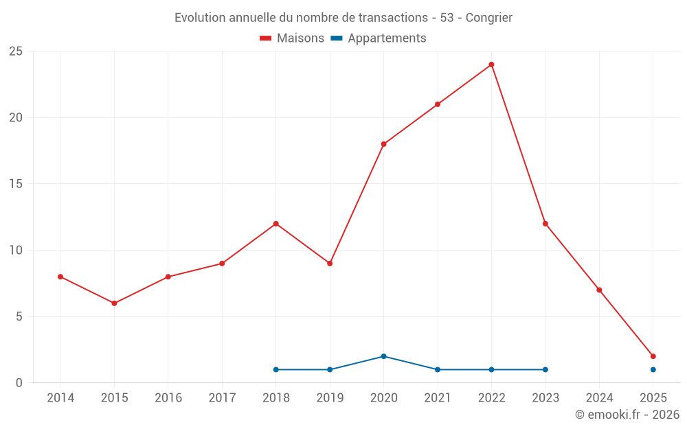 Le prix médian sur les 15 transactions de maisons des 24 derniers mois dans la commune de Congrier était de 1 283 € par mètre carré pour une valeur foncière médiane de 118 500 €. Sur cette période 60% des transactions se sont situées entre 613 et 1 516 € par mètre carré (du 2ème au 8ème déciles).