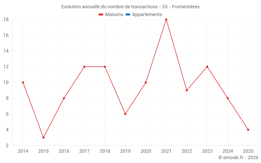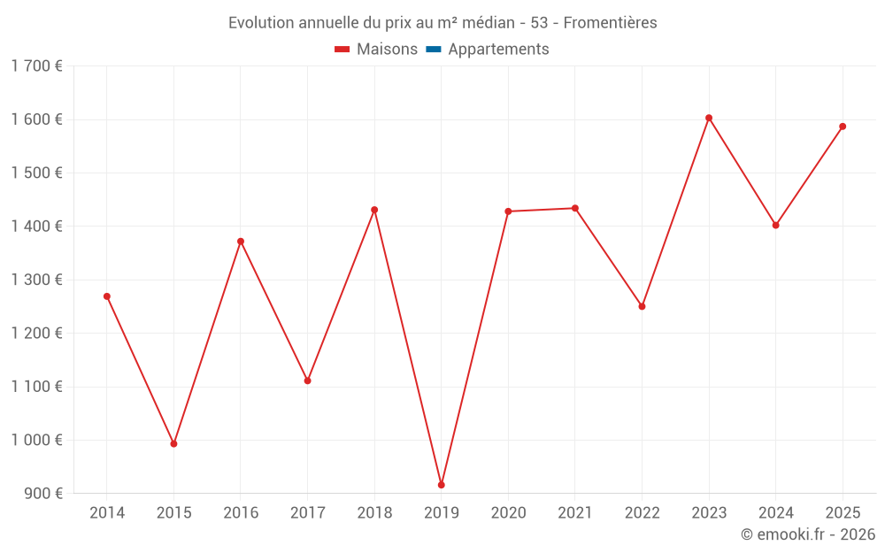 Le prix médian sur les 22 transactions de maisons des 24 derniers mois dans la commune de Fromentières était de 1 520 € par mètre carré pour une valeur foncière médiane de 171 545 €. Sur cette période 60% des transactions se sont situées entre 982 et 1 863 € par mètre carré (du 2ème au 8ème déciles).