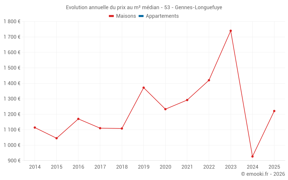Le prix médian sur les 25 transactions de maisons des 24 derniers mois dans la commune de Gennes-Longuefuye était de 1 300 € par mètre carré pour une valeur foncière médiane de 131 500 €. Sur cette période 60% des transactions se sont situées entre 879 et 1 807 € par mètre carré (du 2ème au 8ème déciles).