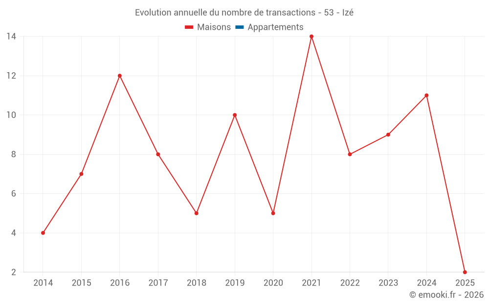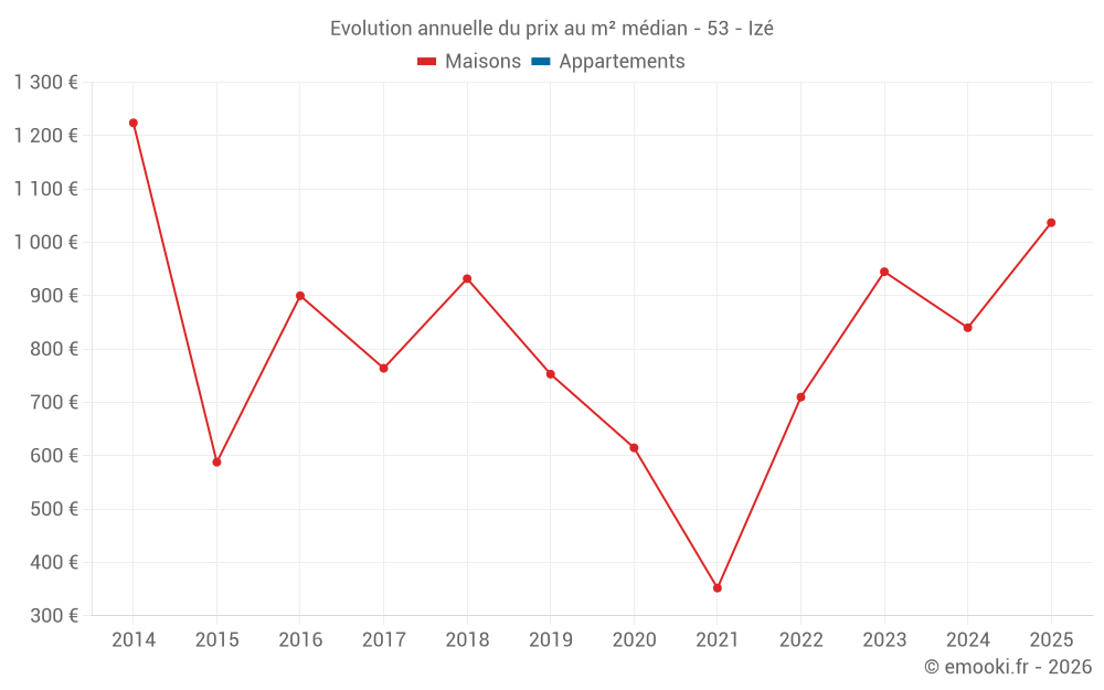 Le prix médian sur les 18 transactions de maisons des 24 derniers mois dans la commune d'Izé était de 900 € par mètre carré pour une valeur foncière médiane de 72 750 €. Sur cette période 60% des transactions se sont situées entre 722 et 1 515 € par mètre carré (du 2ème au 8ème déciles).