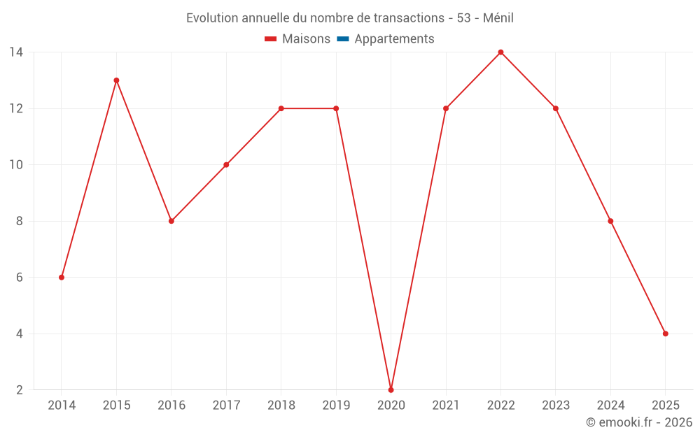 Le prix médian sur les 17 transactions de maisons des 24 derniers mois dans la commune de Ménil était de 1 651 € par mètre carré pour une valeur foncière médiane de 205 000 €. Sur cette période 60% des transactions se sont situées entre 1 448 et 2 353 € par mètre carré (du 2ème au 8ème déciles).