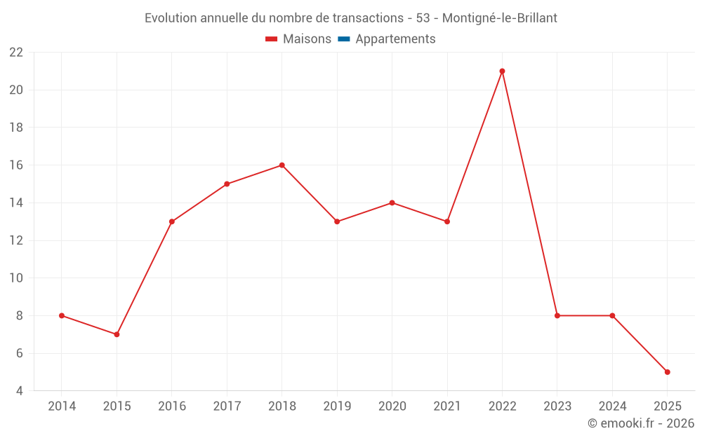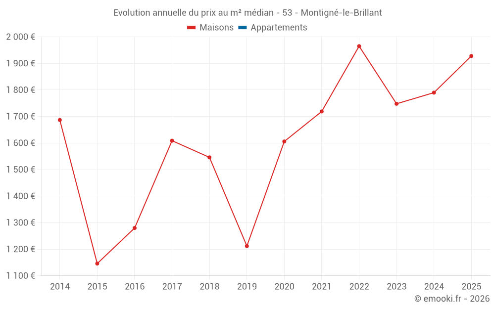 Le prix médian sur les 18 transactions de maisons des 24 derniers mois dans la commune de Montigné-le-Brillant était de 1 872 € par mètre carré pour une valeur foncière médiane de 186 500 €. Sur cette période 60% des transactions se sont situées entre 1 653 et 2 314 € par mètre carré (du 2ème au 8ème déciles).