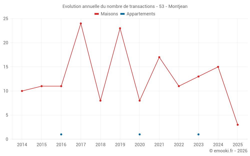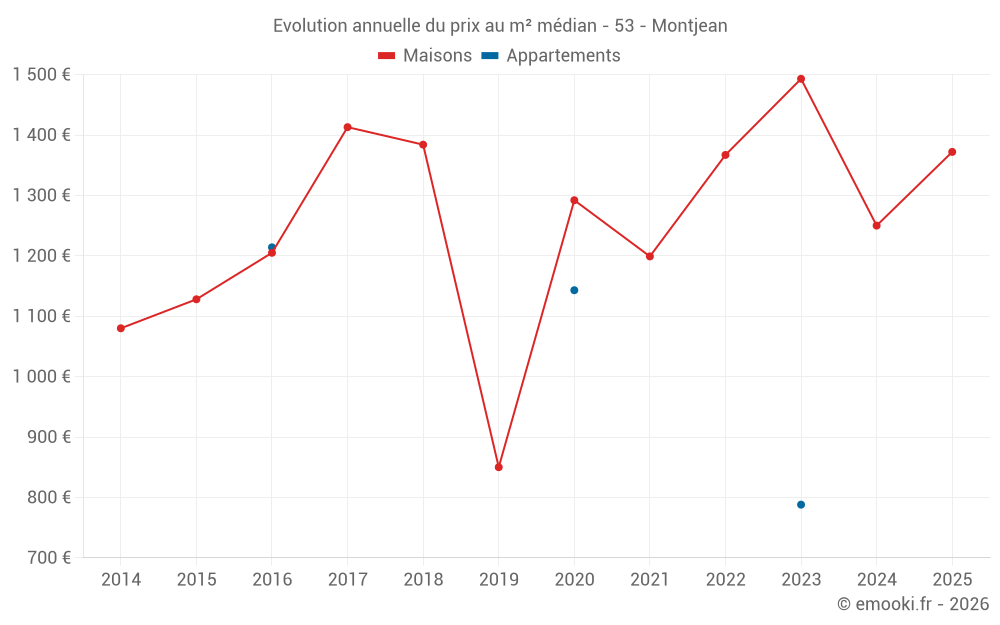 Le prix médian sur les 26 transactions de maisons des 24 derniers mois dans la commune de Montjean était de 1 311 € par mètre carré pour une valeur foncière médiane de 121 500 €. Sur cette période 60% des transactions se sont situées entre 745 et 1 846 € par mètre carré (du 2ème au 8ème déciles).