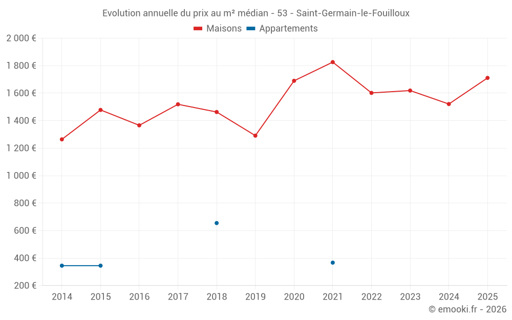 Le prix médian sur les 30 transactions de maisons des 24 derniers mois dans la commune de Saint-Germain-le-Fouilloux était de 1 643 € par mètre carré pour une valeur foncière médiane de 164 200 €. Sur cette période 60% des transactions se sont situées entre 1 237 et 2 184 € par mètre carré (du 2ème au 8ème déciles).