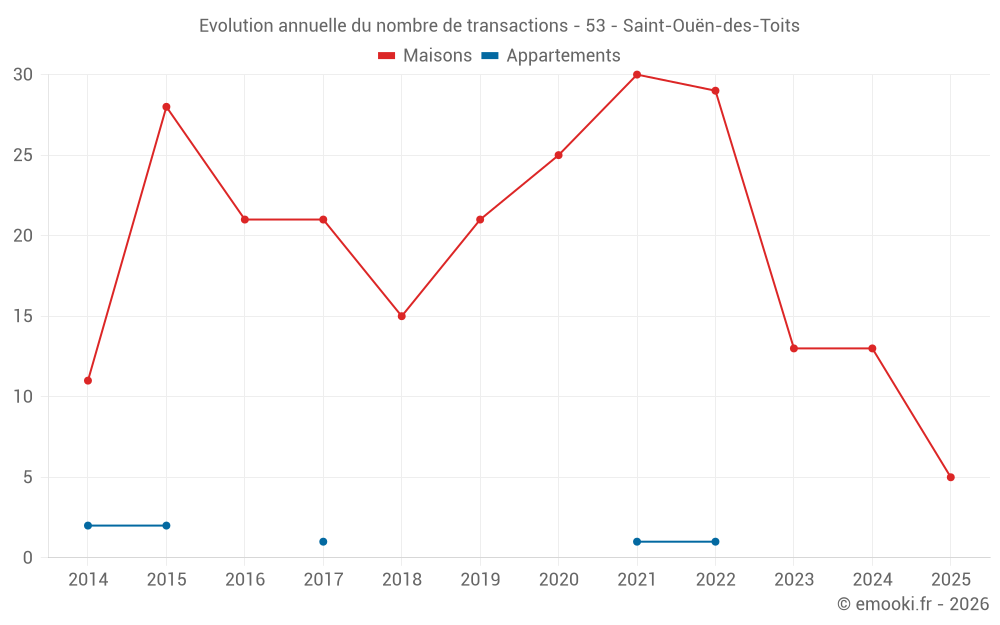 Le prix médian sur les 24 transactions de maisons des 24 derniers mois dans la commune de Saint-Ouën-des-Toits était de 1 660 € par mètre carré pour une valeur foncière médiane de 169 250 €. Sur cette période 60% des transactions se sont situées entre 1 138 et 1 939 € par mètre carré (du 2ème au 8ème déciles).