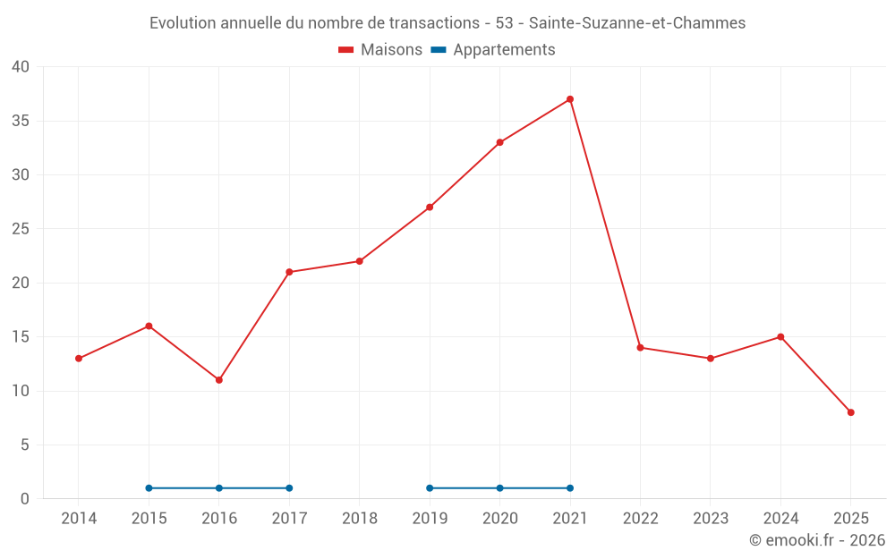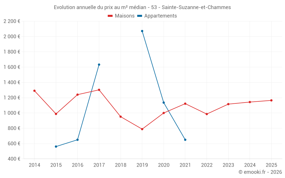 Le prix médian sur les 20 transactions de maisons des 12 derniers mois dans la commune de Sainte-Suzanne-et-Chammes était de 1 138 € par mètre carré pour une valeur foncière médiane de 120 000 €. Sur cette période 60% des transactions se sont situées entre 800 et 1 539 € par mètre carré (du 2ème au 8ème déciles).