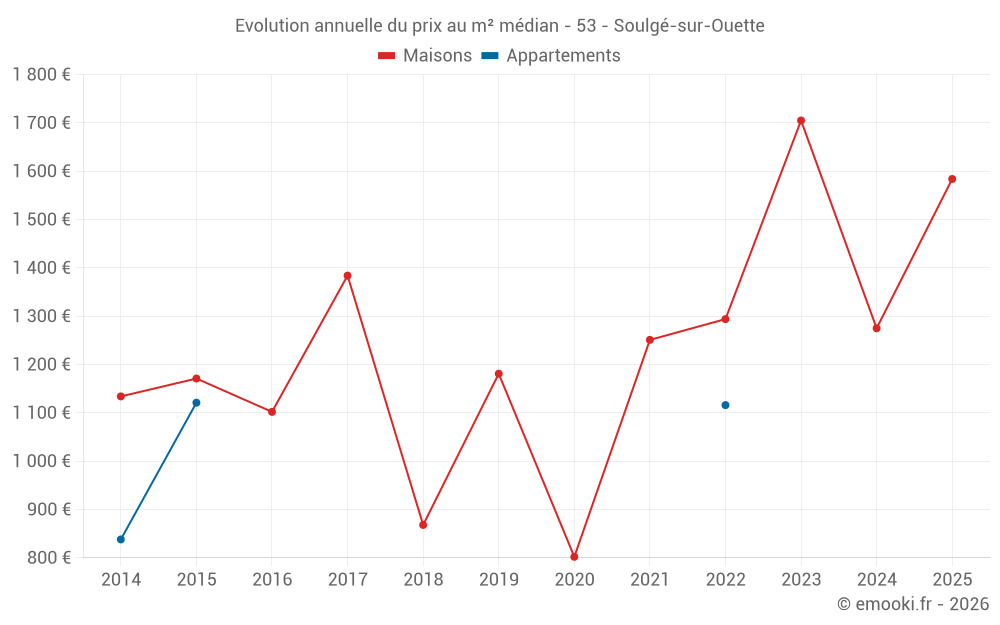 Le prix médian sur les 22 transactions de maisons des 24 derniers mois dans la commune de Soulgé-sur-Ouette était de 1 332 € par mètre carré pour une valeur foncière médiane de 145 250 €. Sur cette période 60% des transactions se sont situées entre 1 045 et 1 892 € par mètre carré (du 2ème au 8ème déciles).