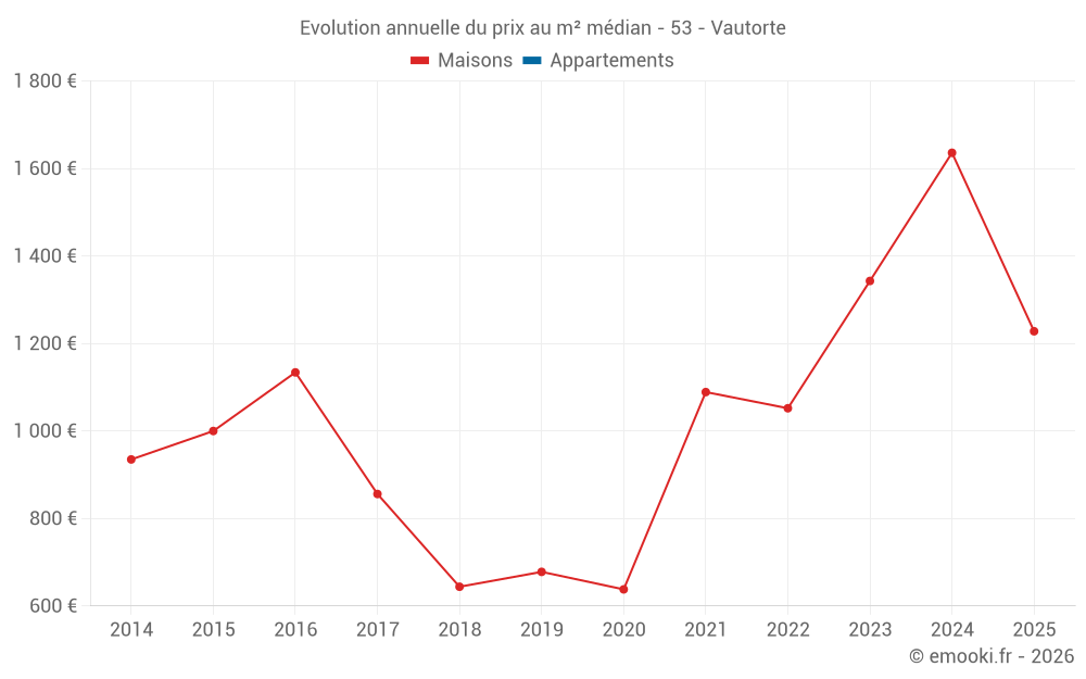 Le prix médian sur les 22 transactions de maisons des 24 derniers mois dans la commune de Vautorte était de 1 240 € par mètre carré pour une valeur foncière médiane de 102 848 €. Sur cette période 60% des transactions se sont situées entre 695 et 2 122 € par mètre carré (du 2ème au 8ème déciles).