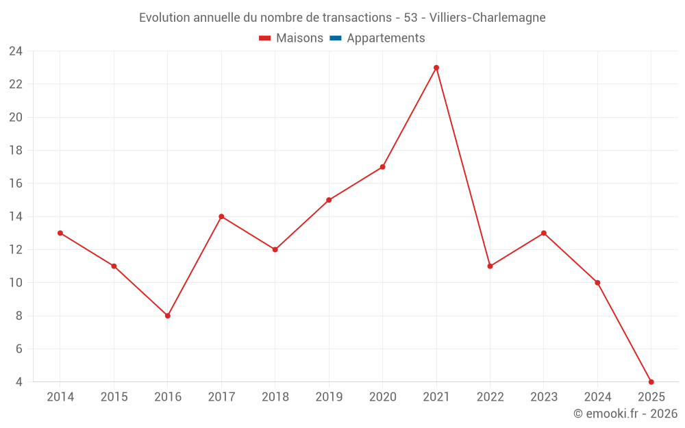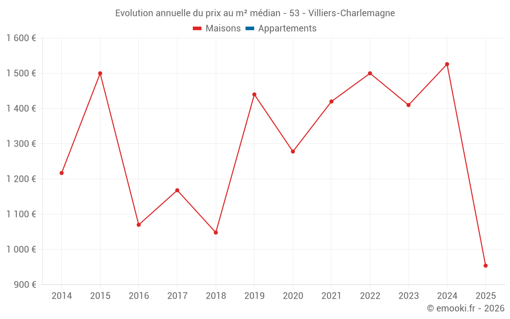 Le prix médian sur les 19 transactions de maisons des 24 derniers mois dans la commune de Villiers-Charlemagne était de 1 423 € par mètre carré pour une valeur foncière médiane de 127 000 €. Sur cette période 60% des transactions se sont situées entre 635 et 1 955 € par mètre carré (du 2ème au 8ème déciles).