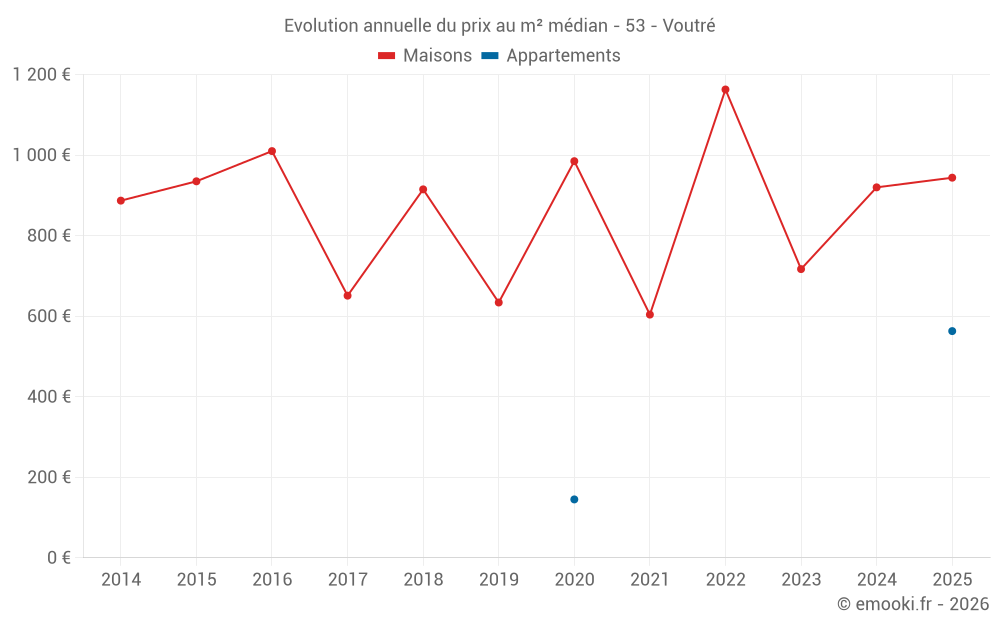 Le prix médian sur les 28 transactions de maisons des 24 derniers mois dans la commune de Voutré était de 972 € par mètre carré pour une valeur foncière médiane de 77 500 €. Sur cette période 60% des transactions se sont situées entre 302 et 1 336 € par mètre carré (du 2ème au 8ème déciles).
