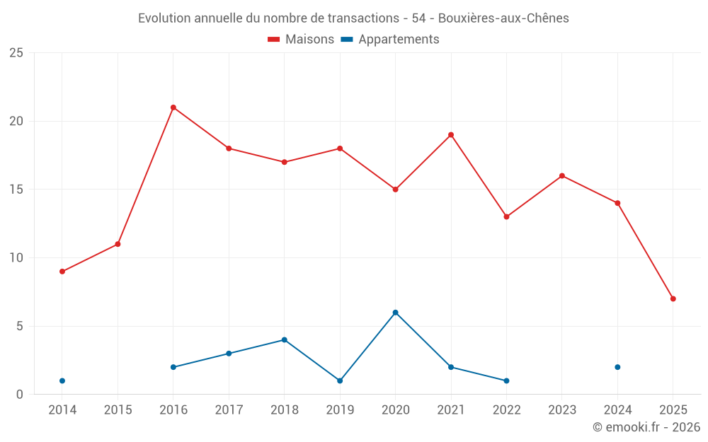 Le prix médian sur les 16 transactions de maisons des 12 derniers mois dans la commune de Bouxières-aux-Chênes était de 2 014 € par mètre carré pour une valeur foncière médiane de 251 875 €. Sur cette période 60% des transactions se sont situées entre 1 394 et 2 659 € par mètre carré (du 2ème au 8ème déciles).