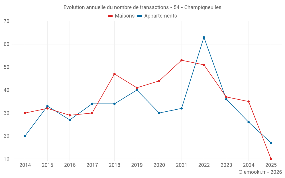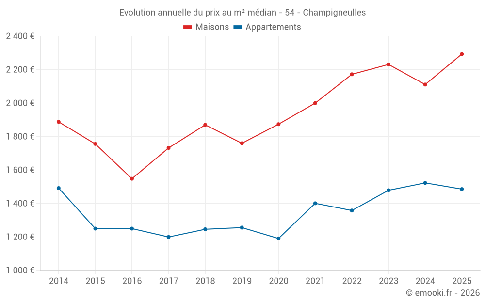 Le prix médian sur les 27 transactions de maisons des 12 derniers mois dans la commune de Champigneulles était de 2 187 € par mètre carré pour une valeur foncière médiane de 190 000 €. Sur cette période 60% des transactions se sont situées entre 1 811 et 2 469 € par mètre carré (du 2ème au 8ème déciles).