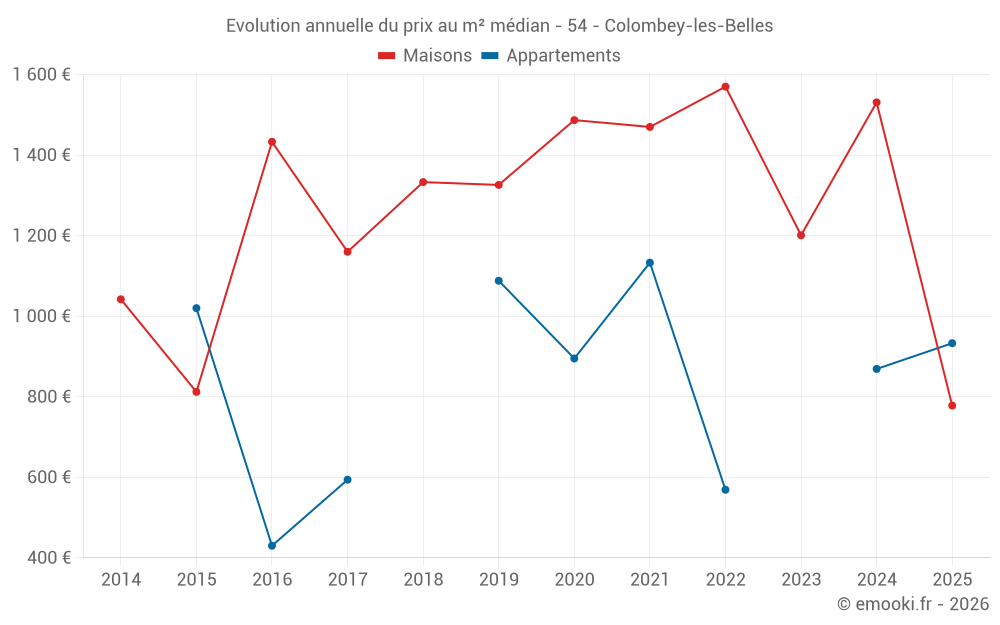 Le prix médian sur les 17 transactions de maisons des 24 derniers mois dans la commune de Colombey-les-Belles était de 1 250 € par mètre carré pour une valeur foncière médiane de 155 000 €. Sur cette période 60% des transactions se sont situées entre 760 et 1 970 € par mètre carré (du 2ème au 8ème déciles).