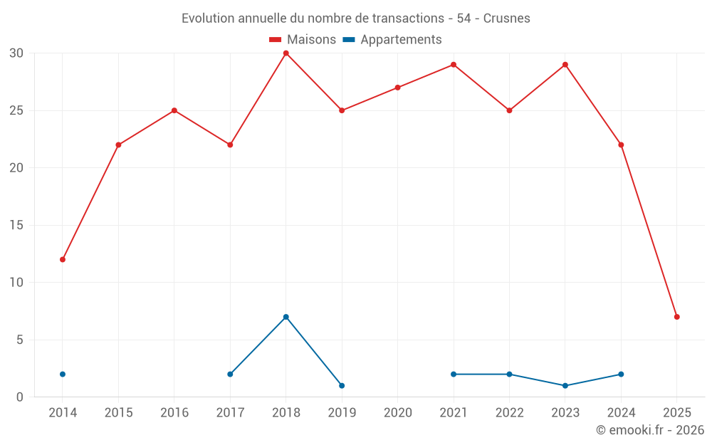 Le prix médian sur les 21 transactions de maisons des 12 derniers mois dans la commune de Crusnes était de 2 481 € par mètre carré pour une valeur foncière médiane de 269 500 €. Sur cette période 60% des transactions se sont situées entre 1 333 et 3 654 € par mètre carré (du 2ème au 8ème déciles).