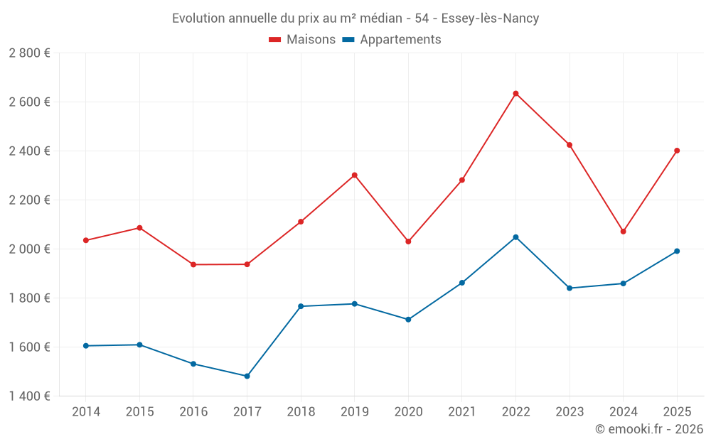 Le prix médian sur les 22 transactions de maisons des 6 derniers mois dans la commune d'Essey-lès-Nancy était de 2 402 € par mètre carré pour une valeur foncière médiane de 232 000 €. Sur cette période 60% des transactions se sont situées entre 1 750 et 2 948 € par mètre carré (du 2ème au 8ème déciles).