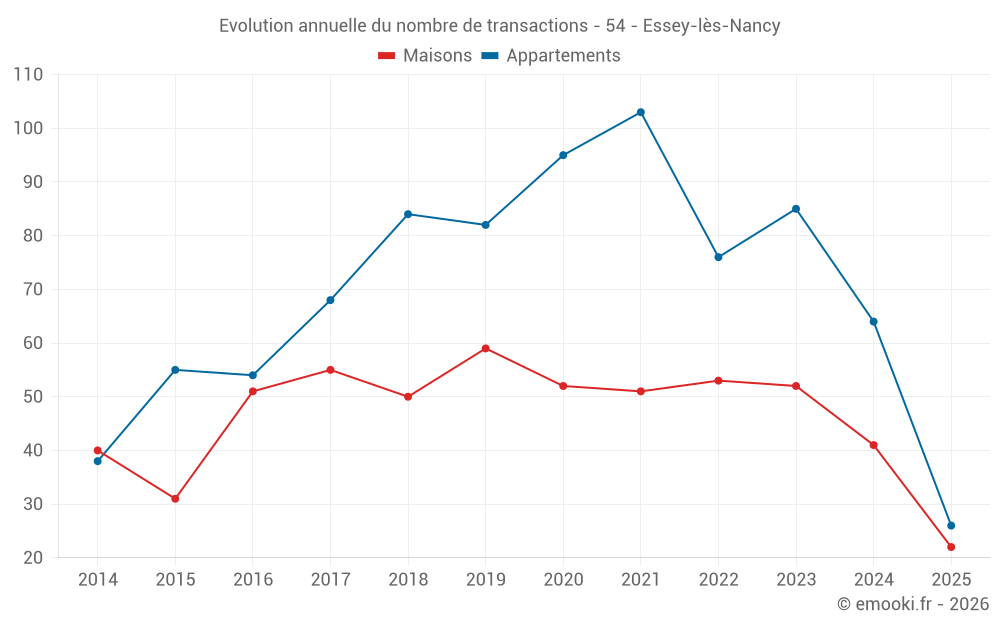 Le prix médian sur les 26 transactions d'appartements des 6 derniers mois dans la commune d'Essey-lès-Nancy était de 1 992 € par mètre carré pour une valeur foncière médiane de 116 750 €. Sur cette période 60% des transactions se sont situées entre 1 401 et 2 457 € par mètre carré (du 2ème au 8ème déciles).