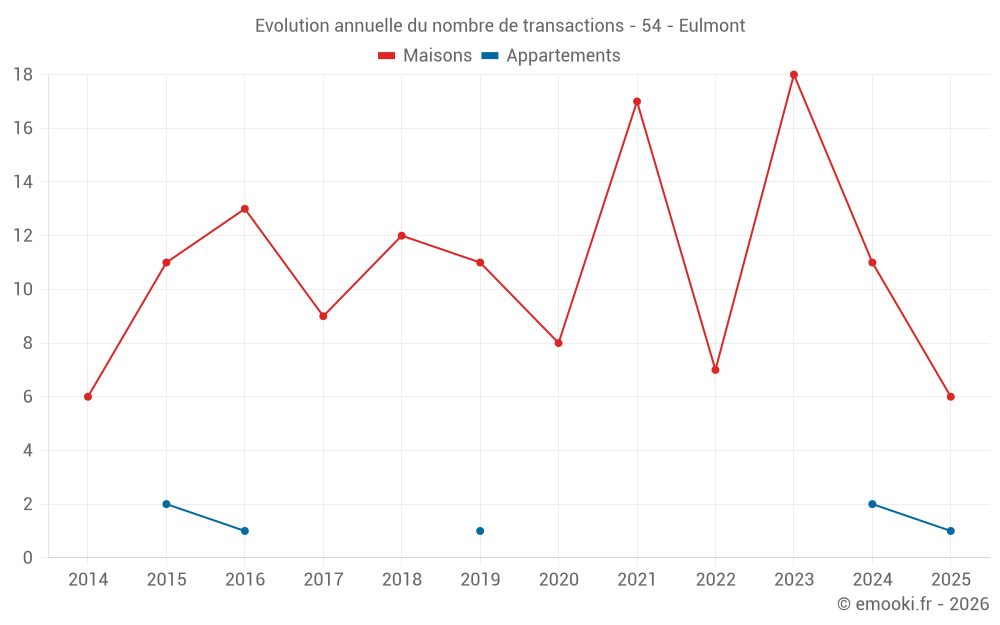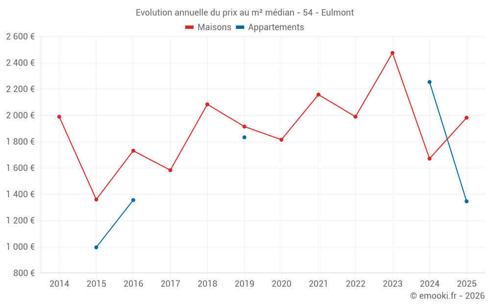 Le prix médian sur les 25 transactions de maisons des 24 derniers mois dans la commune d'Eulmont était de 2 011 € par mètre carré pour une valeur foncière médiane de 316 100 €. Sur cette période 60% des transactions se sont situées entre 1 378 et 2 579 € par mètre carré (du 2ème au 8ème déciles).