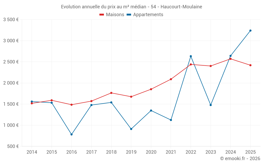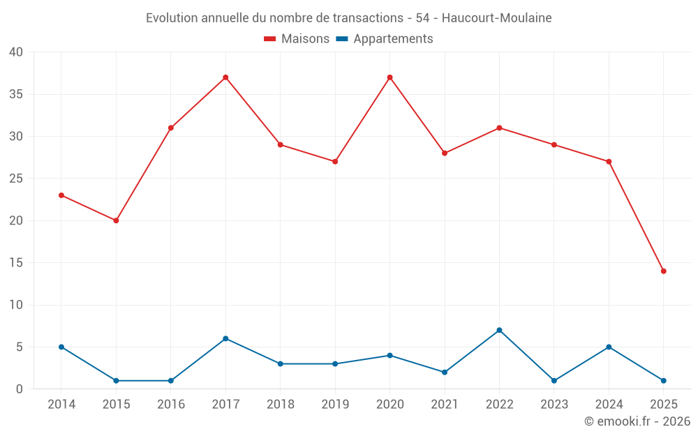 Le prix médian sur les 34 transactions de maisons des 12 derniers mois dans la commune d'Haucourt-Moulaine était de 2 542 € par mètre carré pour une valeur foncière médiane de 218 000 €. Sur cette période 60% des transactions se sont situées entre 1 979 et 2 927 € par mètre carré (du 2ème au 8ème déciles).