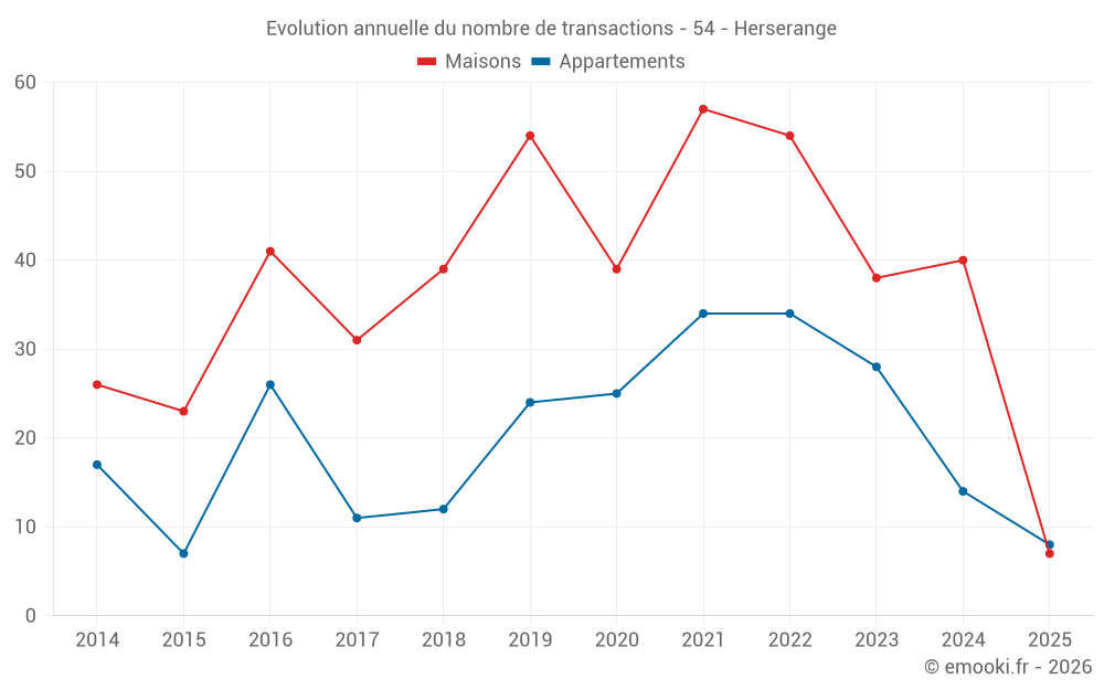 Le prix médian sur les 27 transactions de maisons des 12 derniers mois dans la commune d'Herserange était de 1 786 € par mètre carré pour une valeur foncière médiane de 155 000 €. Sur cette période 60% des transactions se sont situées entre 1 438 et 2 433 € par mètre carré (du 2ème au 8ème déciles).