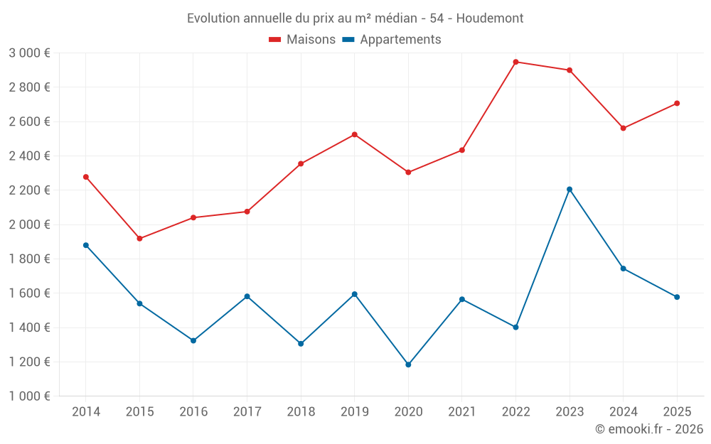 Le prix médian sur les 22 transactions de maisons des 24 derniers mois dans la commune d'Houdemont était de 2 627 € par mètre carré pour une valeur foncière médiane de 269 500 €. Sur cette période 60% des transactions se sont situées entre 2 087 et 2 951 € par mètre carré (du 2ème au 8ème déciles).