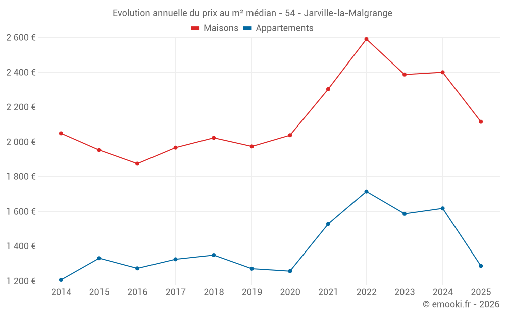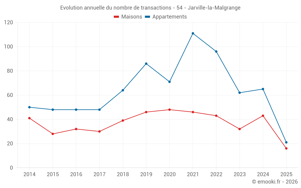 Le prix médian sur les 40 transactions de maisons des 12 derniers mois dans la commune de Jarville-la-Malgrange était de 2 442 € par mètre carré pour une valeur foncière médiane de 197 200 €. Sur cette période 60% des transactions se sont situées entre 1 949 et 2 746 € par mètre carré (du 2ème au 8ème déciles).
