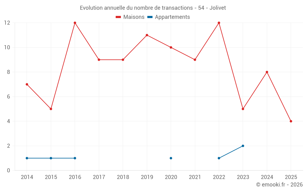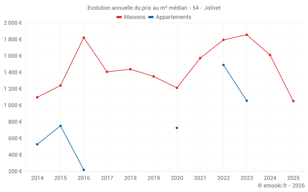 Le prix médian sur les 15 transactions de maisons des 24 derniers mois dans la commune de Jolivet était de 1 465 € par mètre carré pour une valeur foncière médiane de 158 300 €. Sur cette période 60% des transactions se sont situées entre 772 et 1 780 € par mètre carré (du 2ème au 8ème déciles).