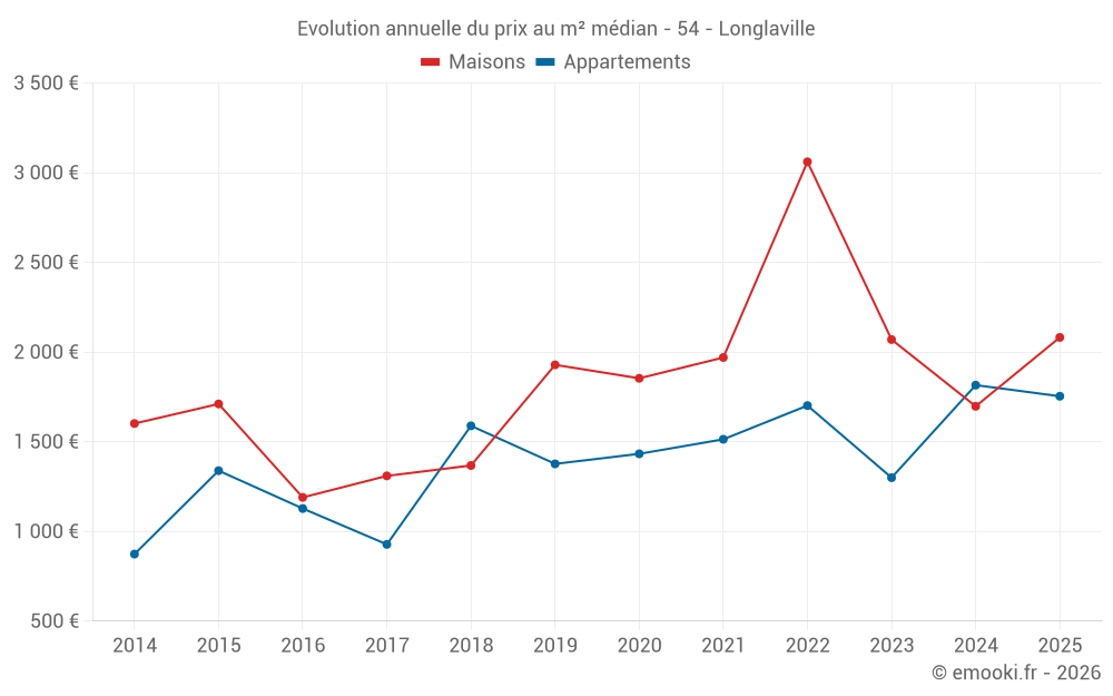 Le prix médian sur les 22 transactions de maisons des 12 derniers mois dans la commune de Longlaville était de 1 695 € par mètre carré pour une valeur foncière médiane de 145 000 €. Sur cette période 60% des transactions se sont situées entre 1 304 et 2 615 € par mètre carré (du 2ème au 8ème déciles).