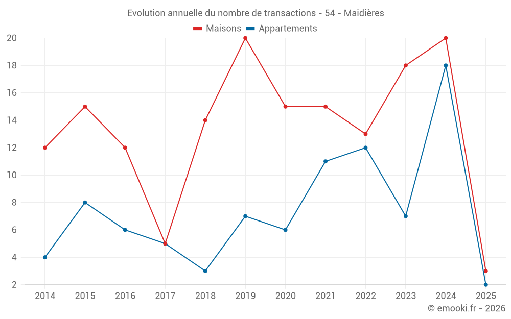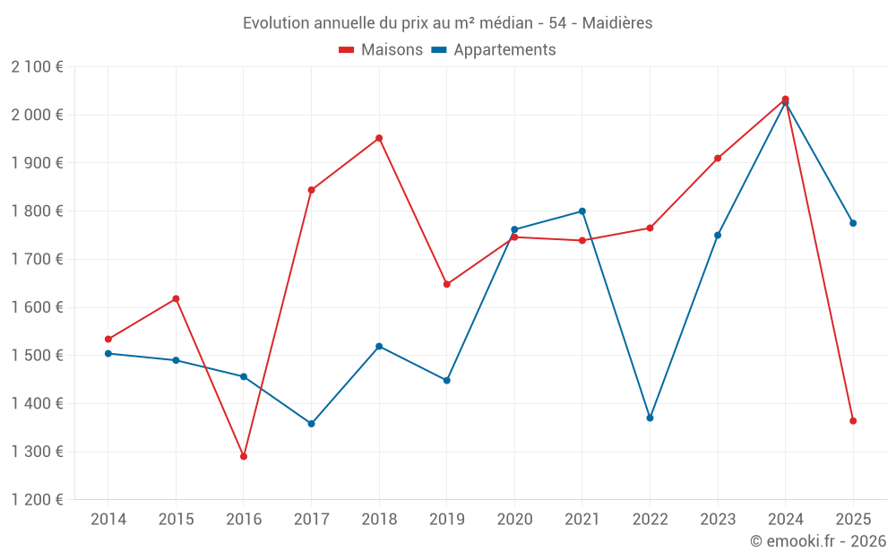 Le prix médian sur les 22 transactions d'appartements des 24 derniers mois dans la commune de Maidières était de 1 886 € par mètre carré pour une valeur foncière médiane de 123 000 €. Sur cette période 60% des transactions se sont situées entre 1 531 et 2 325 € par mètre carré (du 2ème au 8ème déciles).