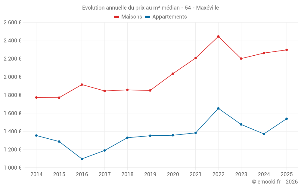 Le prix médian sur les 22 transactions d'appartements des 6 derniers mois dans la commune de Maxéville était de 1 540 € par mètre carré pour une valeur foncière médiane de 92 280 €. Sur cette période 60% des transactions se sont situées entre 1 163 et 2 326 € par mètre carré (du 2ème au 8ème déciles).