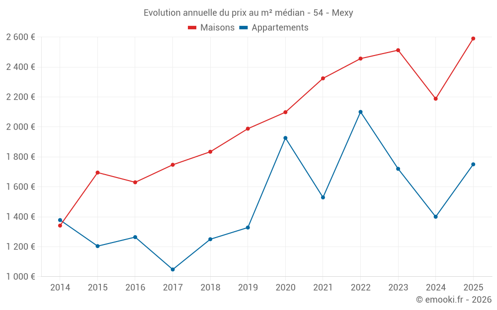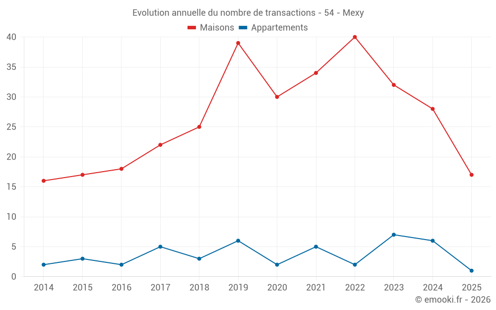 Le prix médian sur les 31 transactions de maisons des 12 derniers mois dans la commune de Mexy était de 2 343 € par mètre carré pour une valeur foncière médiane de 213 800 €. Sur cette période 60% des transactions se sont situées entre 1 921 et 3 077 € par mètre carré (du 2ème au 8ème déciles).