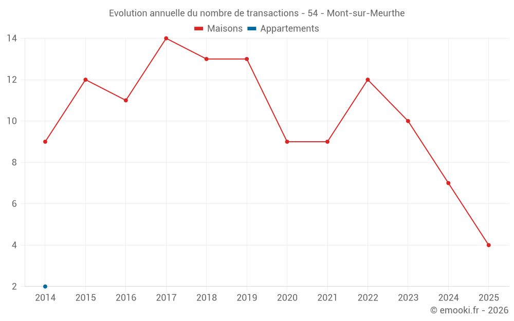 Le prix médian sur les 17 transactions de maisons des 24 derniers mois dans la commune de Mont-sur-Meurthe était de 1 450 € par mètre carré pour une valeur foncière médiane de 160 000 €. Sur cette période 60% des transactions se sont situées entre 1 105 et 2 085 € par mètre carré (du 2ème au 8ème déciles).