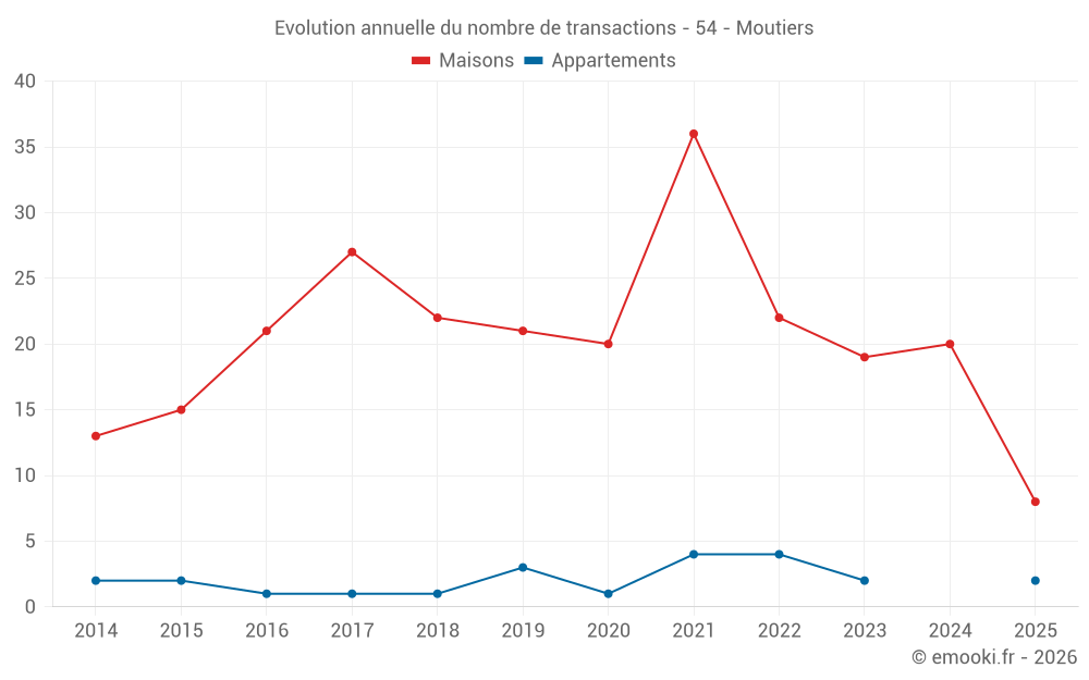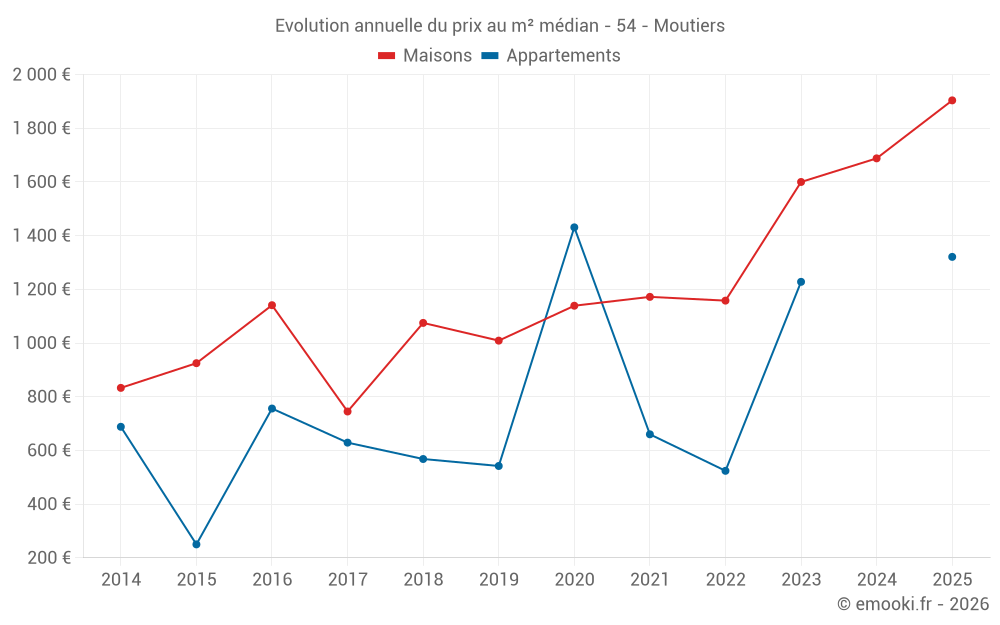 Le prix médian sur les 19 transactions de maisons des 12 derniers mois dans la commune de Moutiers était de 1 875 € par mètre carré pour une valeur foncière médiane de 113 150 €. Sur cette période 60% des transactions se sont situées entre 1 204 et 2 127 € par mètre carré (du 2ème au 8ème déciles).