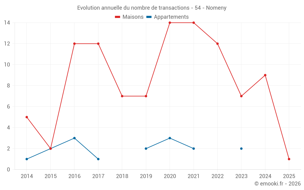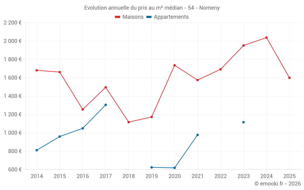 Le prix médian sur les 14 transactions de maisons des 24 derniers mois dans la commune de Nomeny était de 2 013 € par mètre carré pour une valeur foncière médiane de 218 175 €. Sur cette période 60% des transactions se sont situées entre 1 535 et 2 387 € par mètre carré (du 2ème au 8ème déciles).