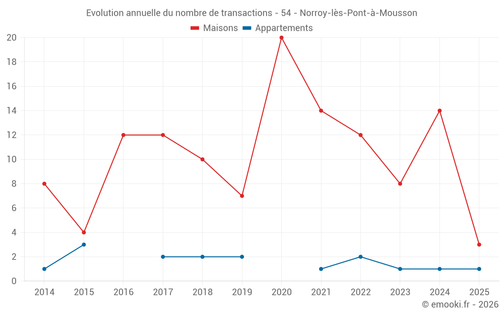 Le prix médian sur les 20 transactions de maisons des 24 derniers mois dans la commune de Norroy-lès-Pont-à-Mousson était de 2 045 € par mètre carré pour une valeur foncière médiane de 198 125 €. Sur cette période 60% des transactions se sont situées entre 1 668 et 2 439 € par mètre carré (du 2ème au 8ème déciles).