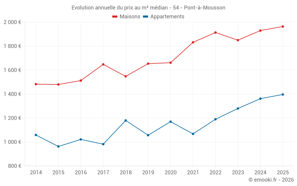 Le prix médian sur les 27 transactions de maisons des 6 derniers mois dans la commune de Pont-à-Mousson était de 1 964 € par mètre carré pour une valeur foncière médiane de 198 000 €. Sur cette période 60% des transactions se sont situées entre 1 359 et 2 601 € par mètre carré (du 2ème au 8ème déciles).