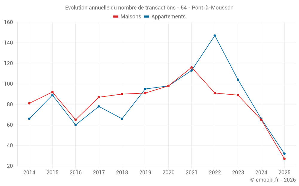 Le prix médian sur les 32 transactions d'appartements des 6 derniers mois dans la commune de Pont-à-Mousson était de 1 397 € par mètre carré pour une valeur foncière médiane de 99 250 €. Sur cette période 60% des transactions se sont situées entre 990 et 1 832 € par mètre carré (du 2ème au 8ème déciles).