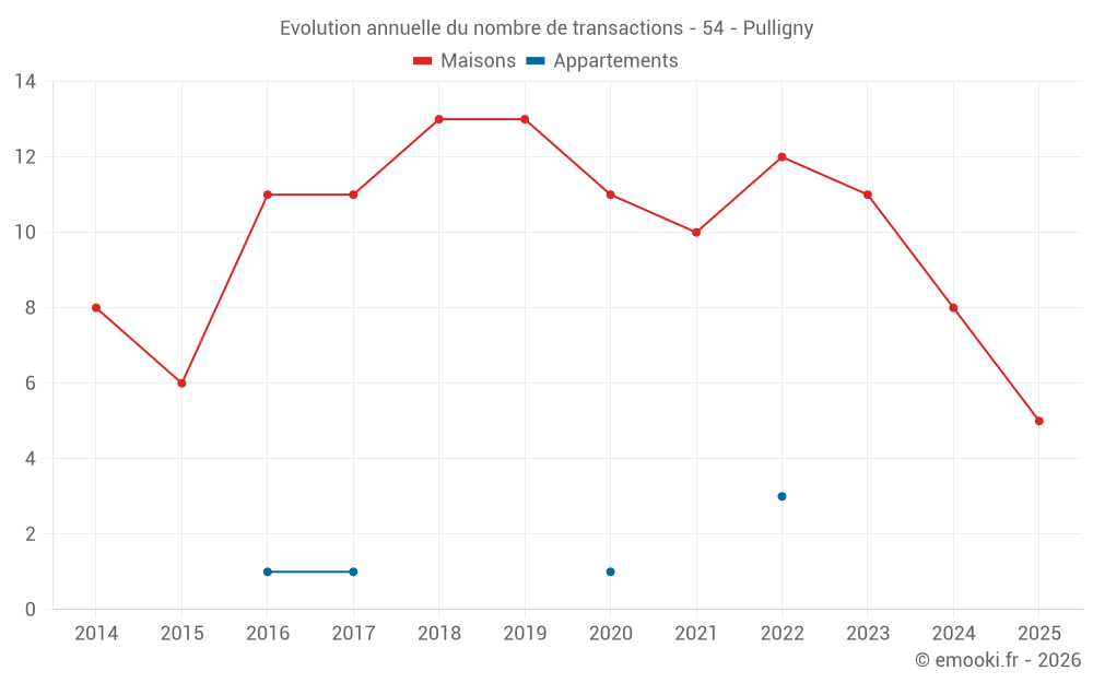 Le prix médian sur les 18 transactions de maisons des 24 derniers mois dans la commune de Pulligny était de 1 752 € par mètre carré pour une valeur foncière médiane de 122 500 €. Sur cette période 60% des transactions se sont situées entre 945 et 2 097 € par mètre carré (du 2ème au 8ème déciles).