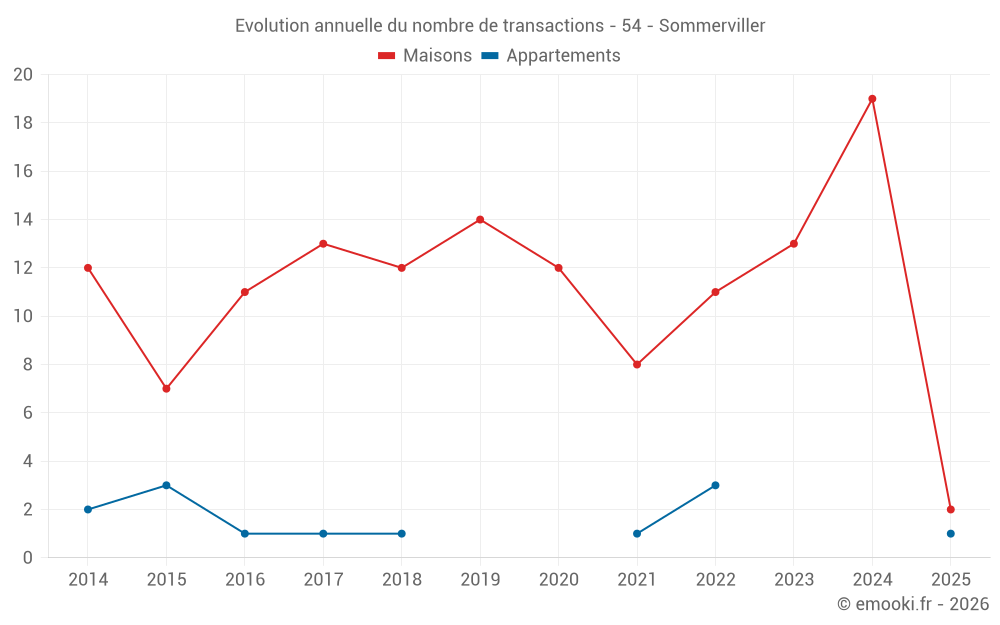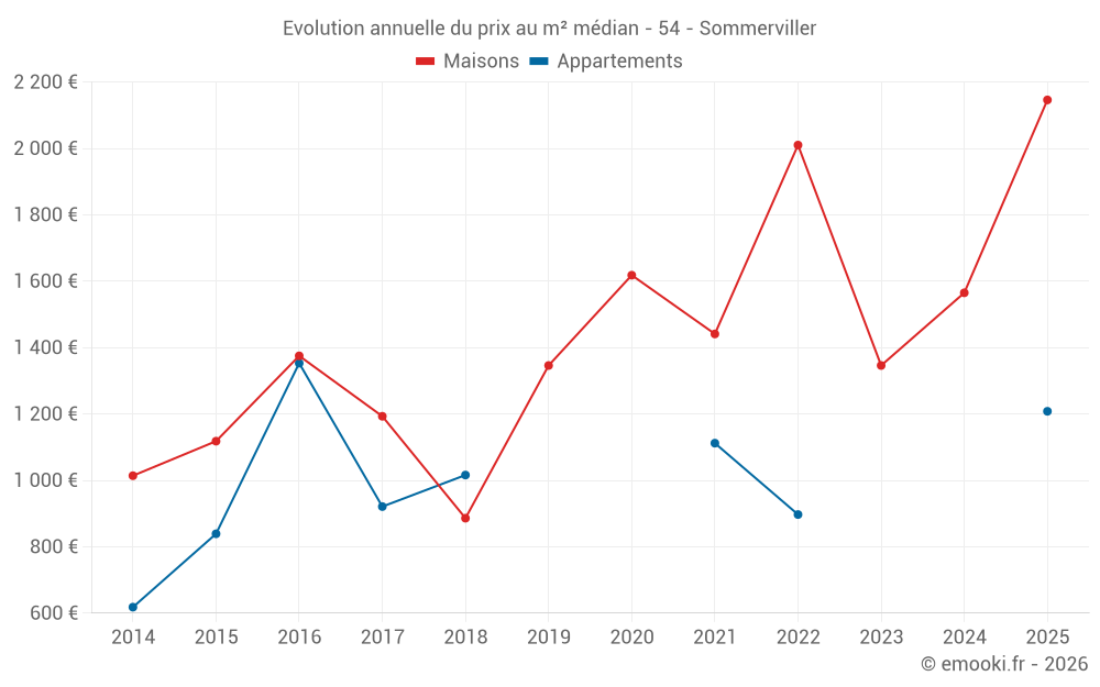 Le prix médian sur les 27 transactions de maisons des 24 derniers mois dans la commune de Sommerviller était de 1 565 € par mètre carré pour une valeur foncière médiane de 200 000 €. Sur cette période 60% des transactions se sont situées entre 1 165 et 2 521 € par mètre carré (du 2ème au 8ème déciles).