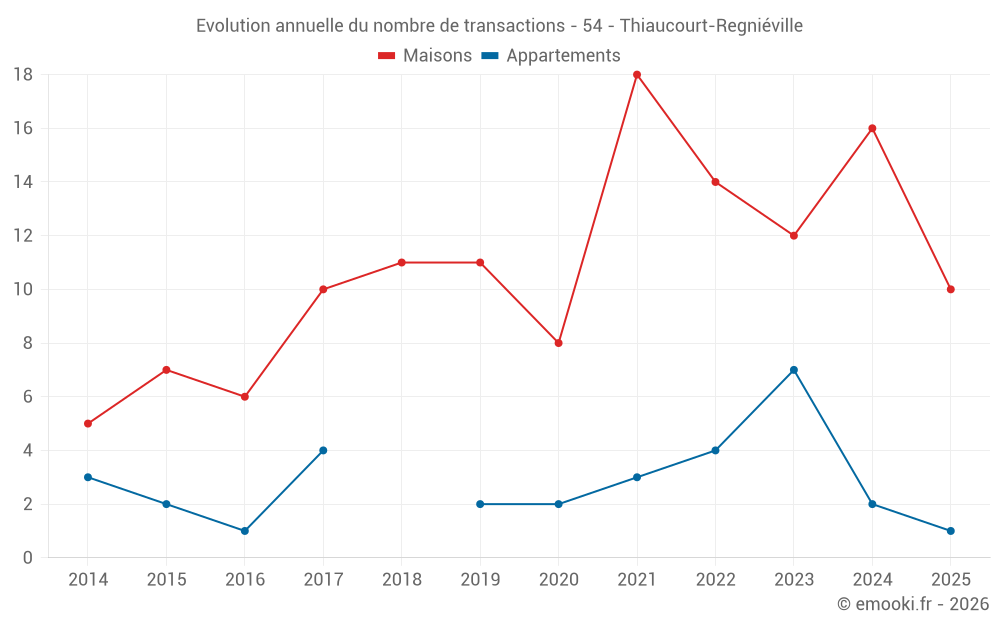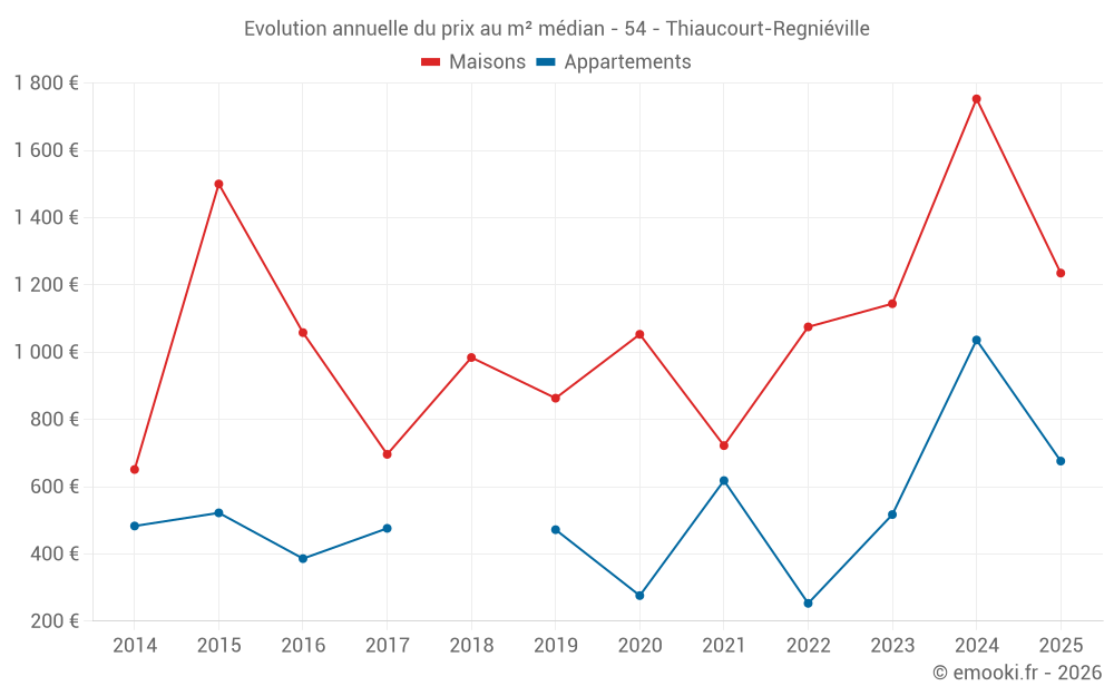Le prix médian sur les 19 transactions de maisons des 12 derniers mois dans la commune de Thiaucourt-Regniéville était de 1 441 € par mètre carré pour une valeur foncière médiane de 148 800 €. Sur cette période 60% des transactions se sont situées entre 915 et 2 108 € par mètre carré (du 2ème au 8ème déciles).