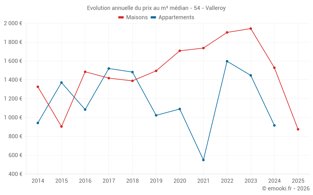 Le prix médian sur les 18 transactions de maisons des 12 derniers mois dans la commune de Valleroy était de 1 446 € par mètre carré pour une valeur foncière médiane de 108 000 €. Sur cette période 60% des transactions se sont situées entre 949 et 2 173 € par mètre carré (du 2ème au 8ème déciles).