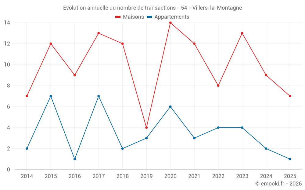 Le prix médian sur les 24 transactions de maisons des 24 derniers mois dans la commune de Villers-la-Montagne était de 2 239 € par mètre carré pour une valeur foncière médiane de 273 000 €. Sur cette période 60% des transactions se sont situées entre 1 576 et 3 199 € par mètre carré (du 2ème au 8ème déciles).