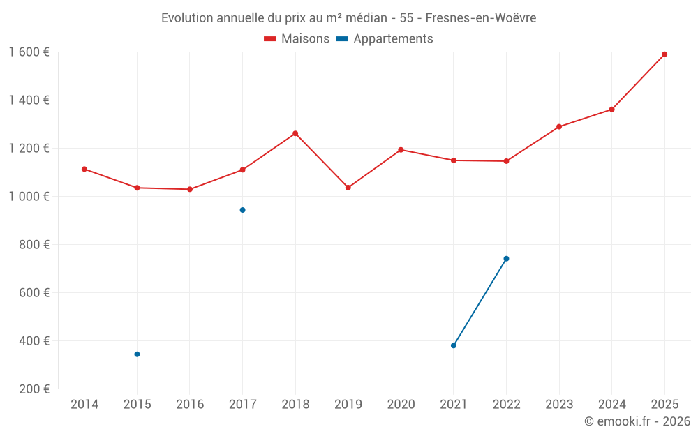 Le prix médian sur les 14 transactions de maisons des 24 derniers mois dans la commune de Fresnes-en-Woëvre était de 1 450 € par mètre carré pour une valeur foncière médiane de 129 350 €. Sur cette période 60% des transactions se sont situées entre 926 et 1 883 € par mètre carré (du 2ème au 8ème déciles).
