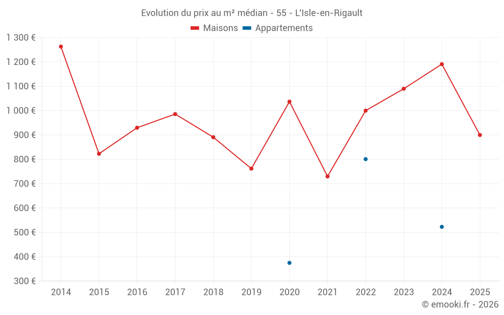 Le prix médian sur les 15 transactions de maisons des 24 derniers mois dans la commune de l'Isle-en-Rigault était de 1 105 € par mètre carré pour une valeur foncière médiane de 90 000 €. Sur cette période 60% des transactions se sont situées entre 662 et 1 315 € par mètre carré (du 2ème au 8ème déciles).
